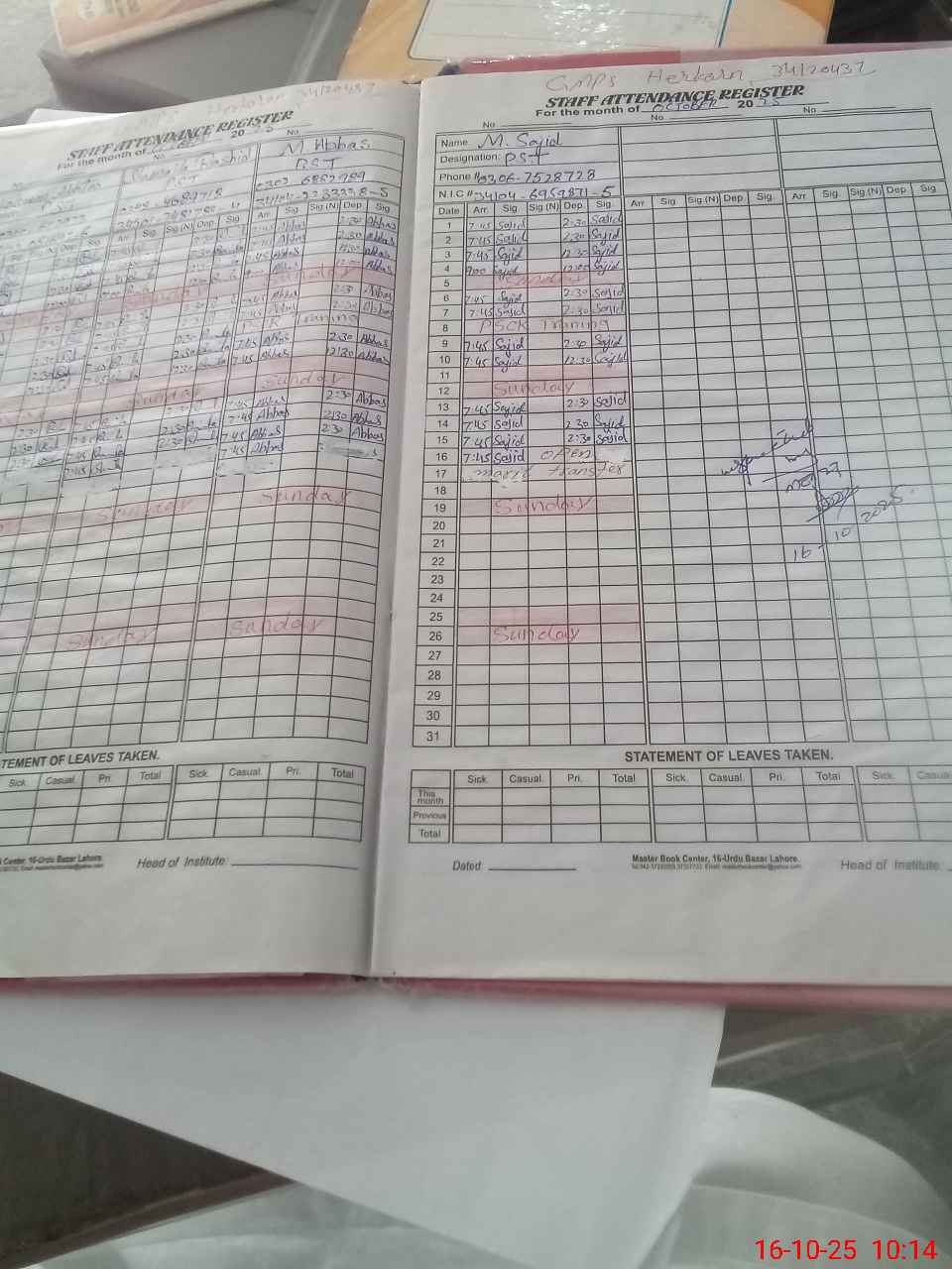| CNIC | Full Name | Designation | R/C | Absence During Last Calender Month |