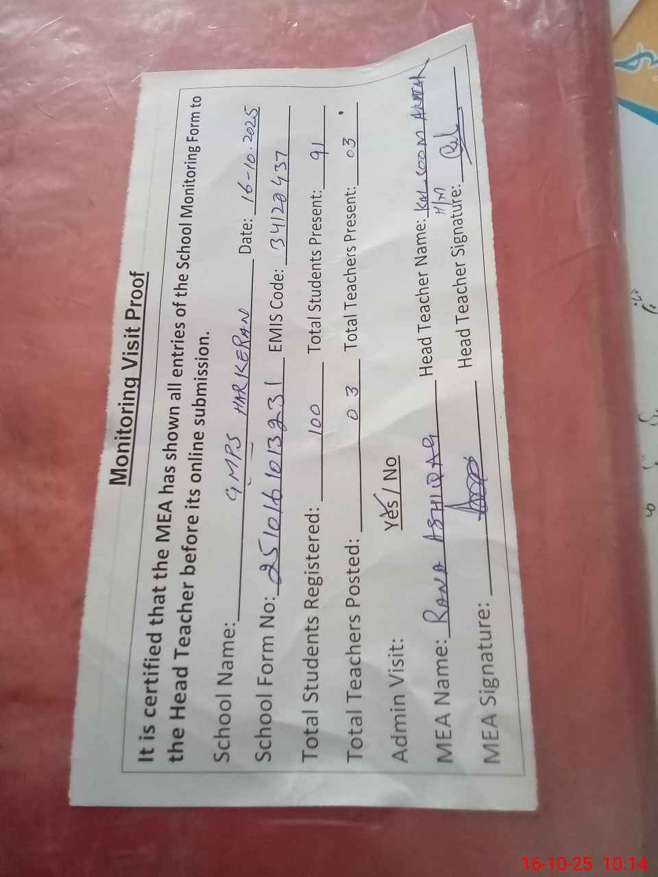| Attendance Register | Head Teacher | MEA with School | Visit Proof |