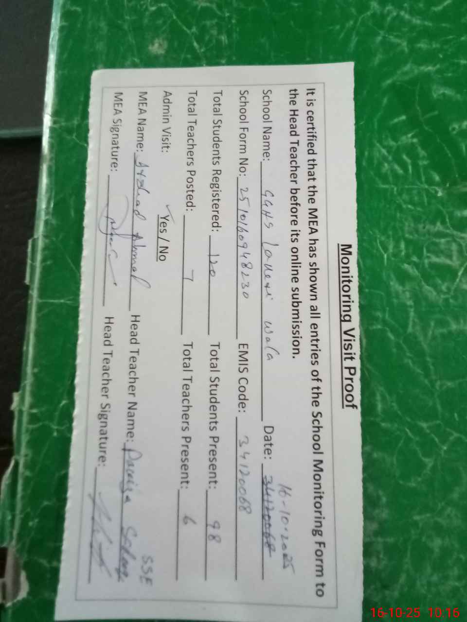 | Attendance Register | Head Teacher | MEA with School | Visit Proof |