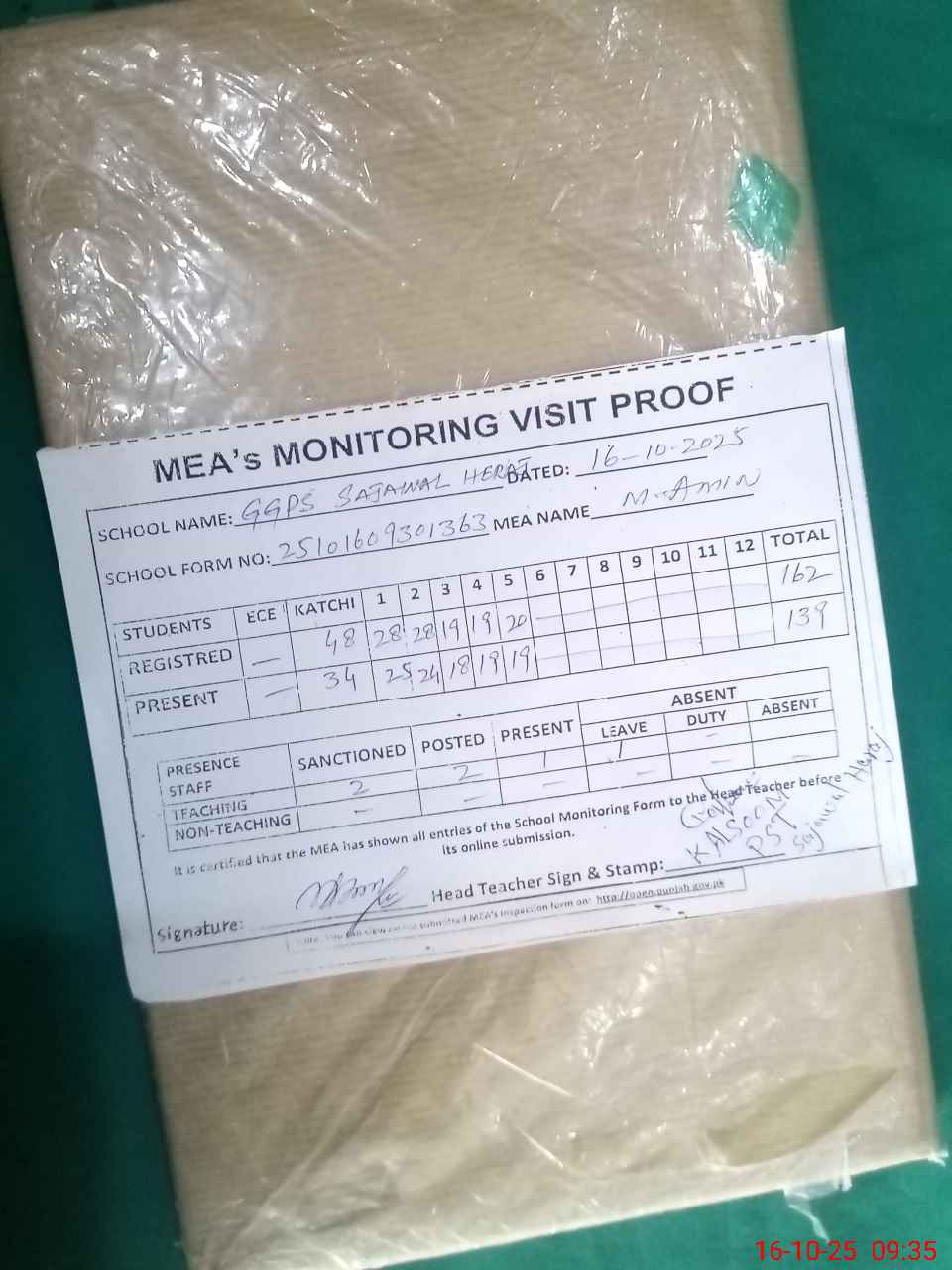 | Attendance Register | Head Teacher | MEA with School | Visit Proof |