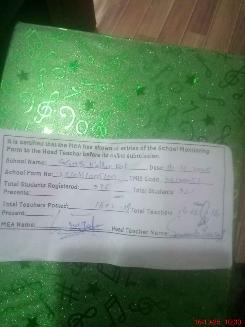 | EMIS Code: 38120051 | Name of School: GGHS KALLUR KOT CITY | |||