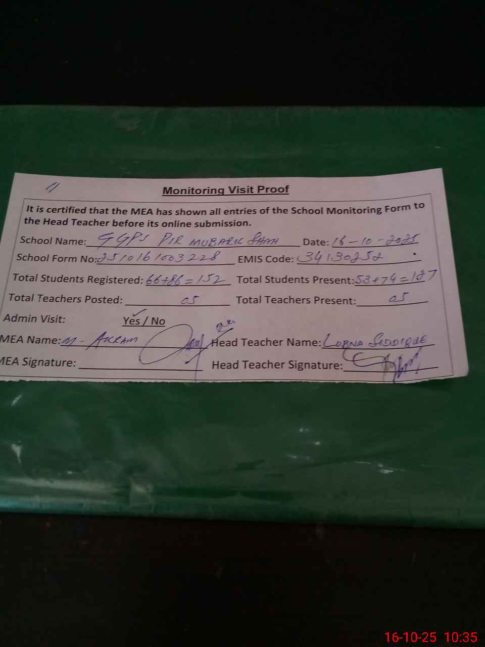 | EMIS Code: 34130252 | Name of School: GGPS PIR MUBARIK SHAH (KAMOKE) | |||