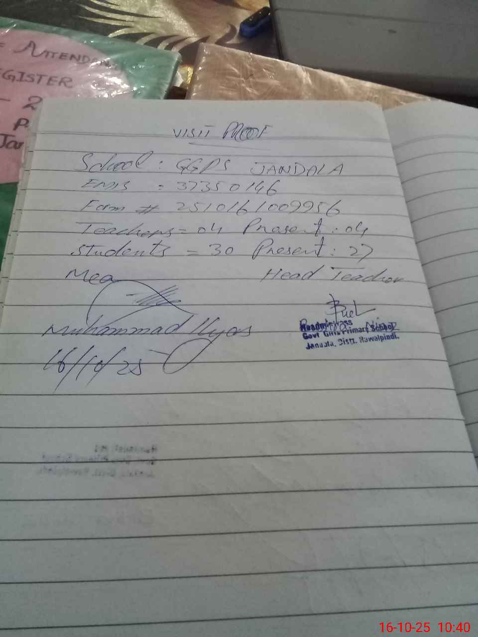| Attendance Register | Head Teacher | MEA with School | Visit Proof |