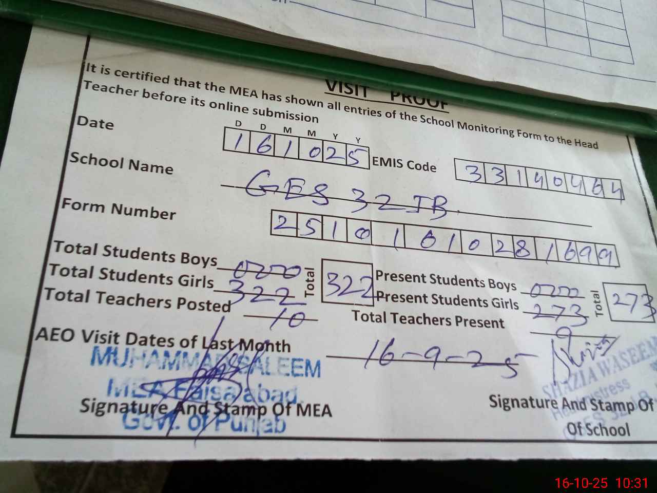 | Certified that this School was Inspected by the Undersigned MEA/DMO Today and the Information Stated Above is as Per Record. | |||||