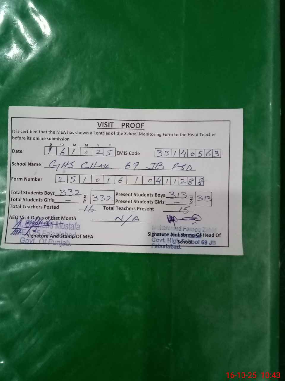 | Certified that this School was Inspected by the Undersigned MEA/DMO Today and the Information Stated Above is as Per Record. | |||||