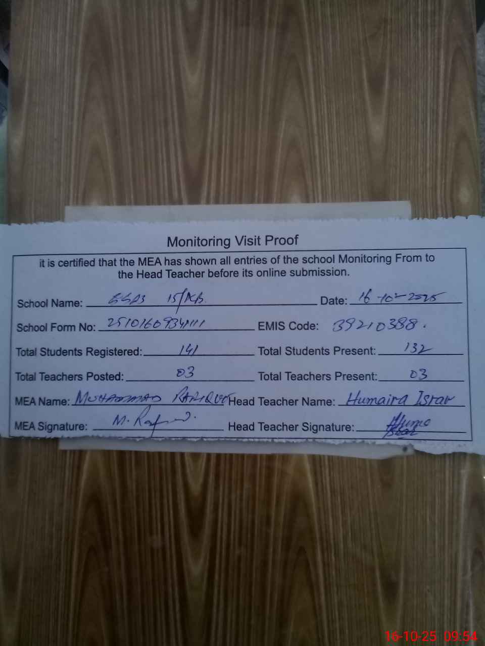 | Attendance Register | Head Teacher | MEA with School | Visit Proof |