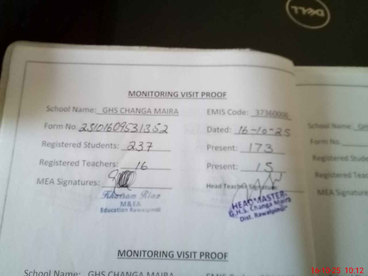 | Attendance Register | Head Teacher | MEA with School | Visit Proof |