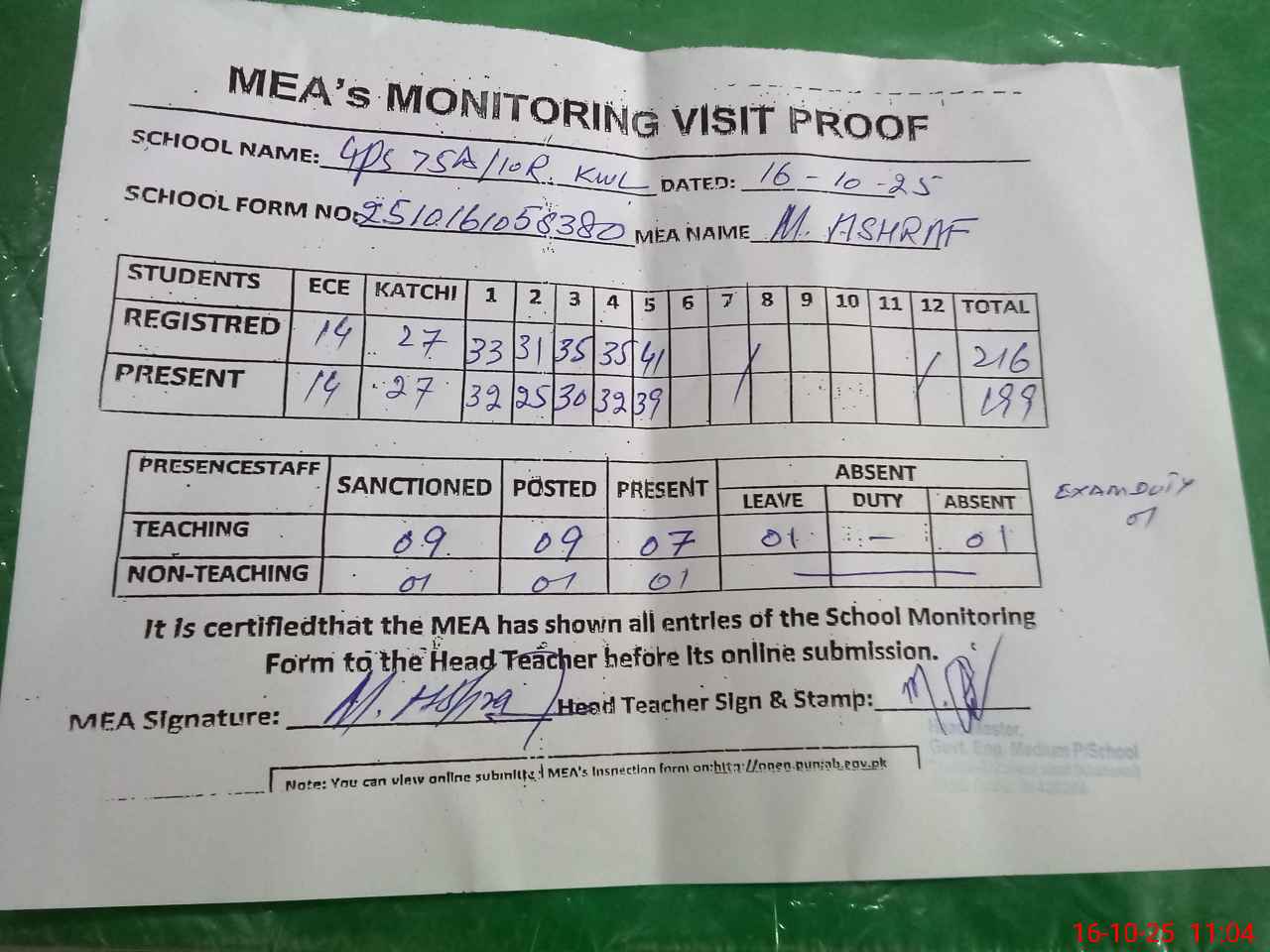| Attendance Register | Head Teacher | MEA with School | Visit Proof |