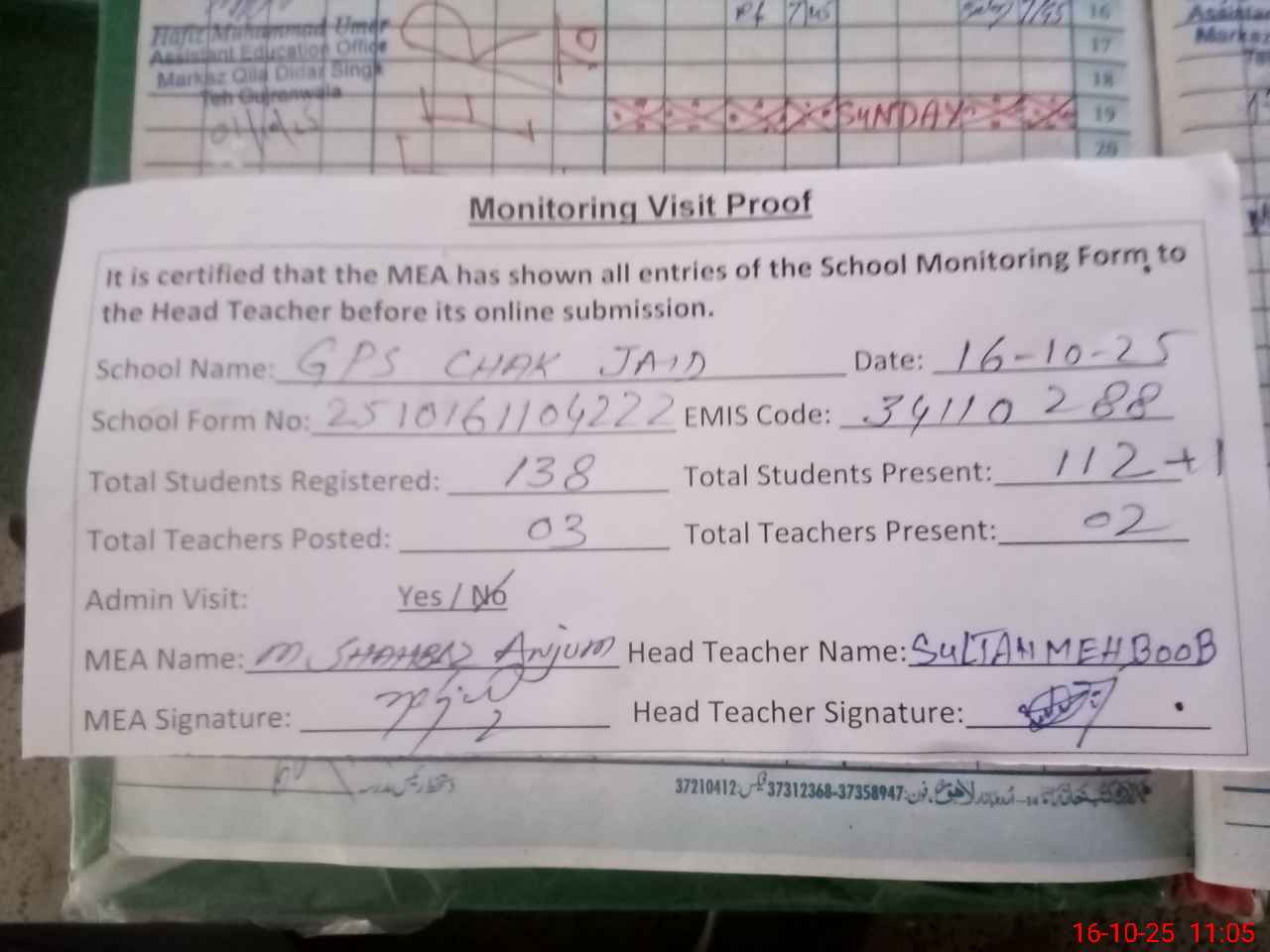 | Attendance Register | Head Teacher | MEA with School | Visit Proof |
