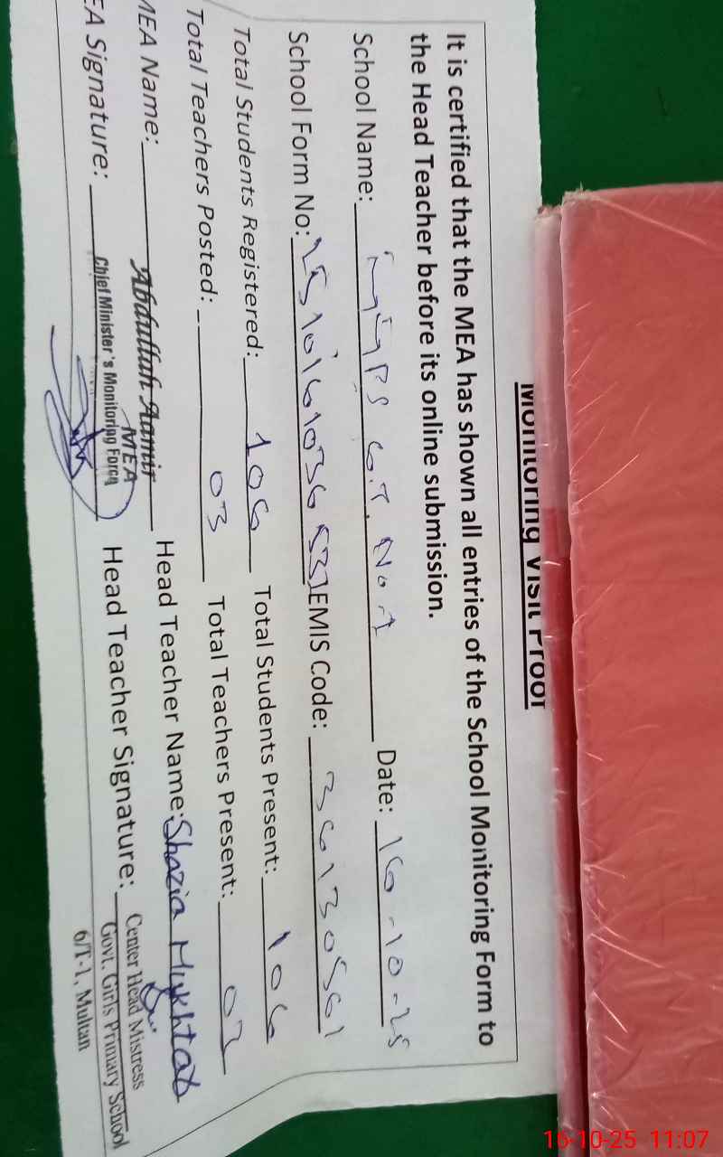 | EMIS Code: 36130561 | Name of School: GGPS 6-T NO.1 P/S MAKHDOOM RASHEED | |||