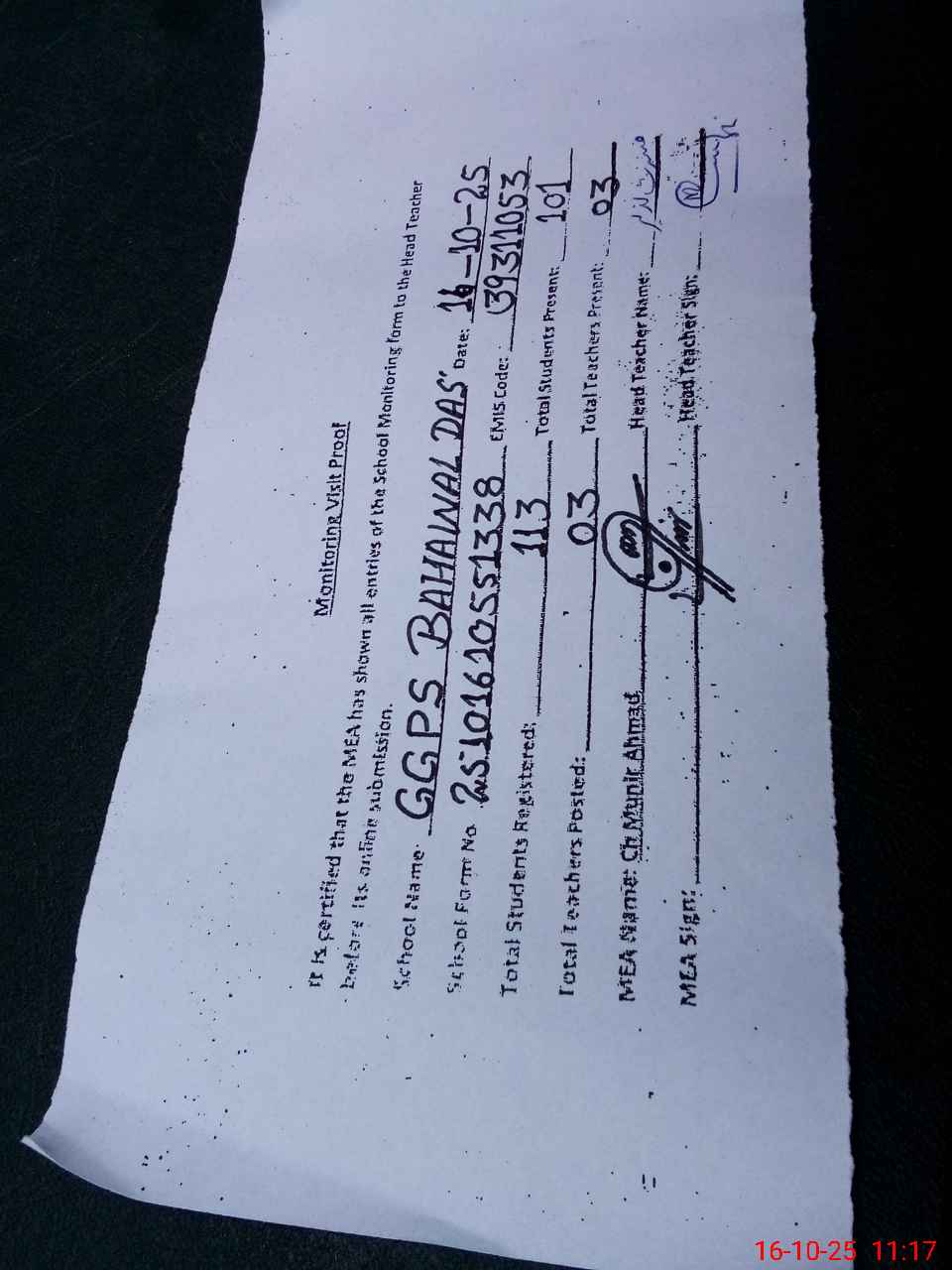 | Certified that this School was Inspected by the Undersigned MEA/DMO Today and the Information Stated Above is as Per Record. | |||||