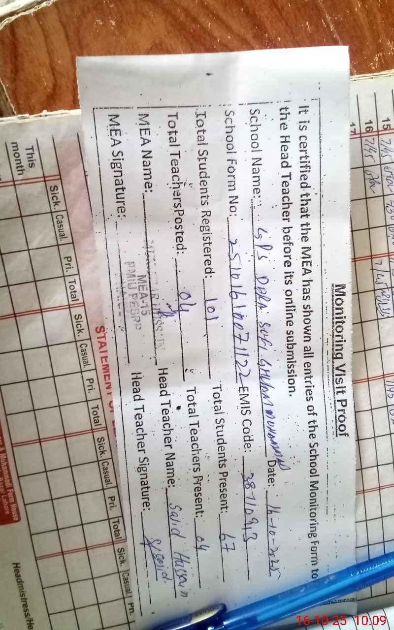 | Attendance Register | Head Teacher | MEA with School | Visit Proof |