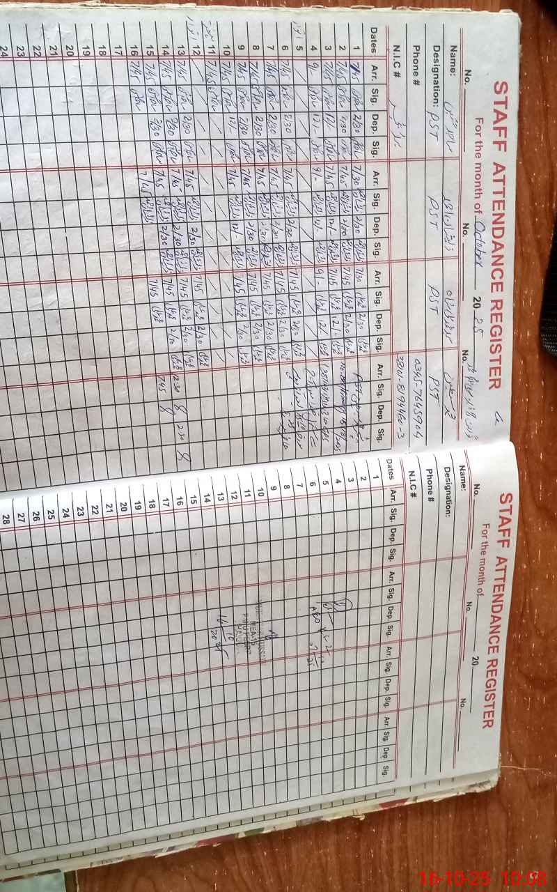 | CNIC | Full Name | Designation | R/C | Absence During Last Calender Month |