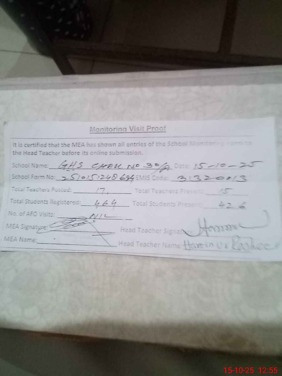 | Certified that this School was Inspected by the Undersigned MEA/DMO Today and the Information Stated Above is as Per Record. | |||||