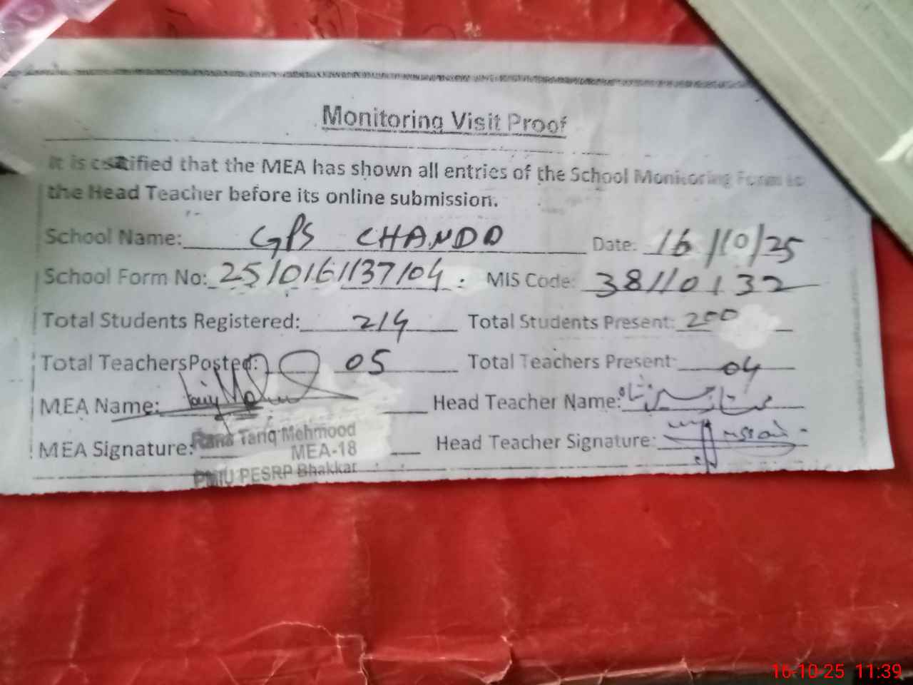 | Attendance Register | Head Teacher | MEA with School | Visit Proof |