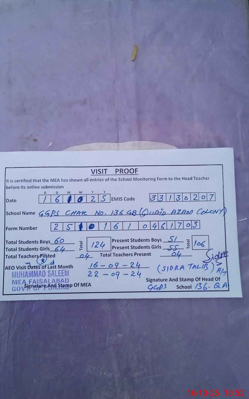 | EMIS Code: 33130207 | Name of School: GGPS CHAK 136 GB QUAID AZAM COLONY SAMUNDRI | |||