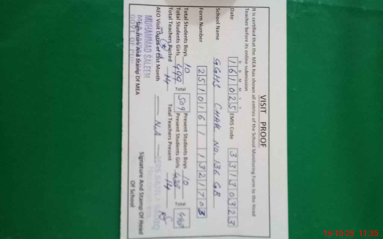 | EMIS Code: 33130323 | Name of School: GGHS CHAK NO 136 GB | |||