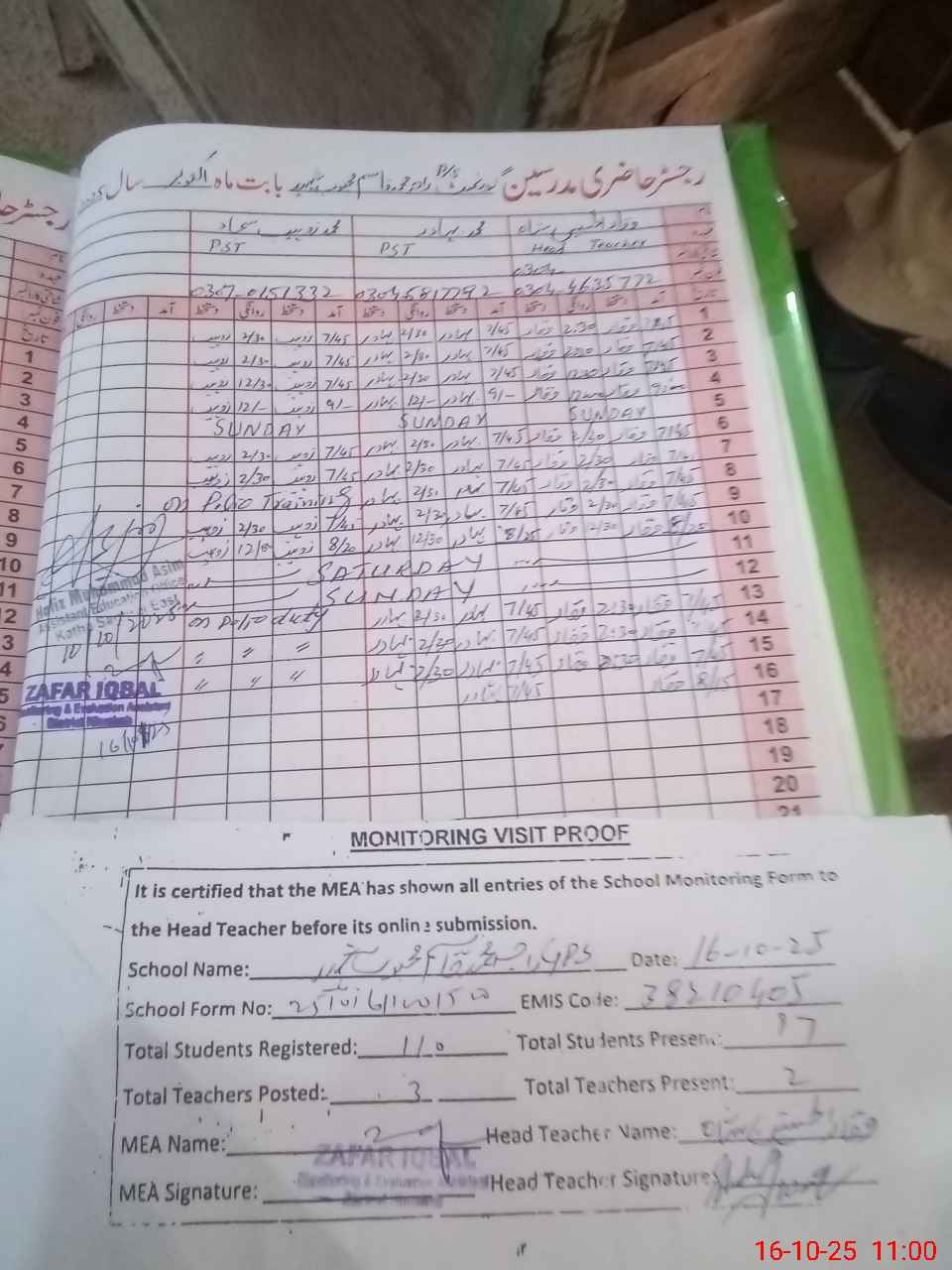 | Monitoring Date: 16-10-2025 | Start Time: 16-10-2025 10:36 AM | End Time: 16-10-2025 11:01 AM | Name of MEA: ZA**** IQ**** | |
