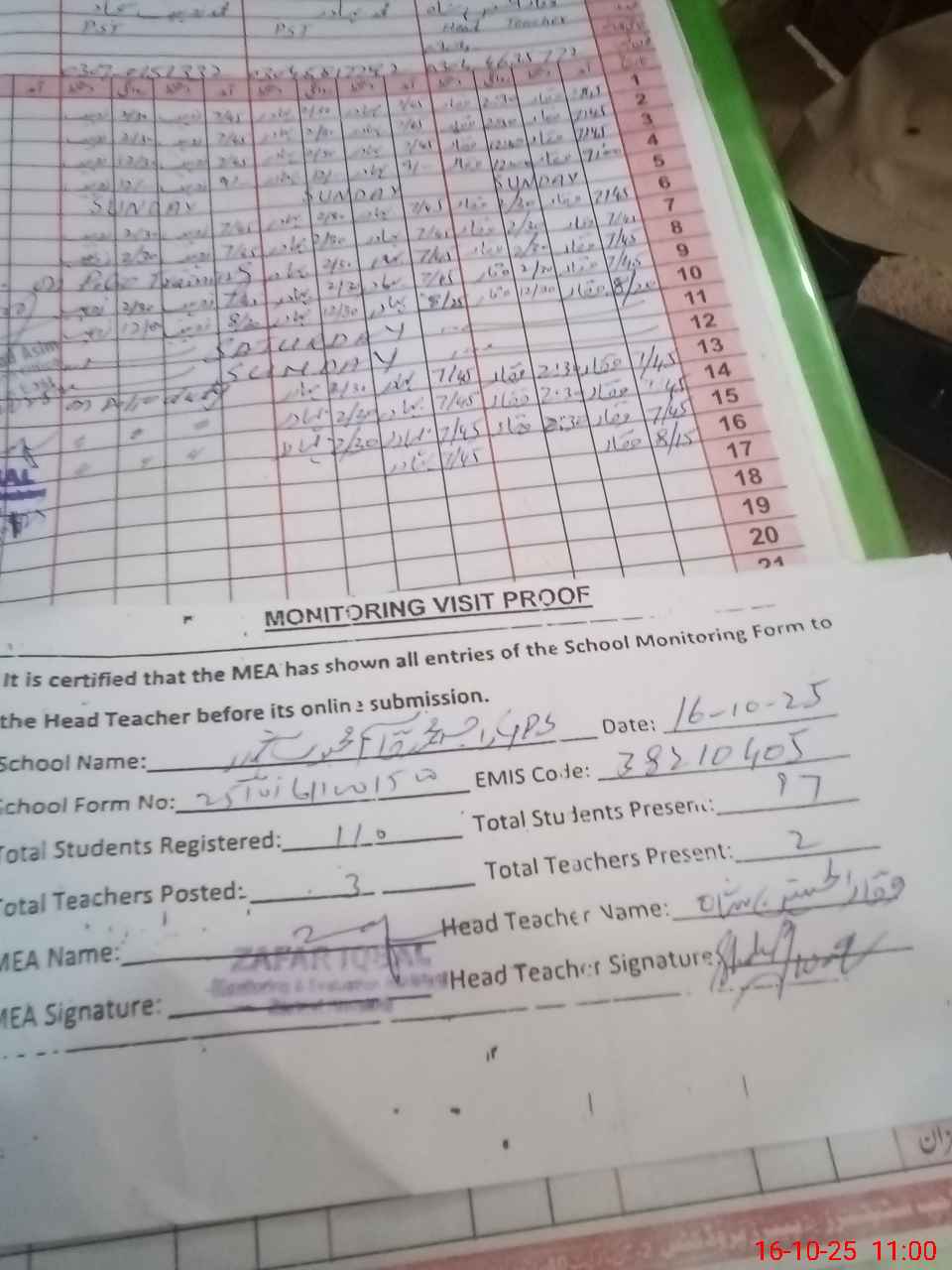 | Attendance Register | Head Teacher | MEA with School | Visit Proof |