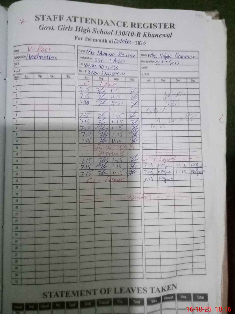 | CNIC | Full Name | Designation | R/C | Absence During Last Calender Month |