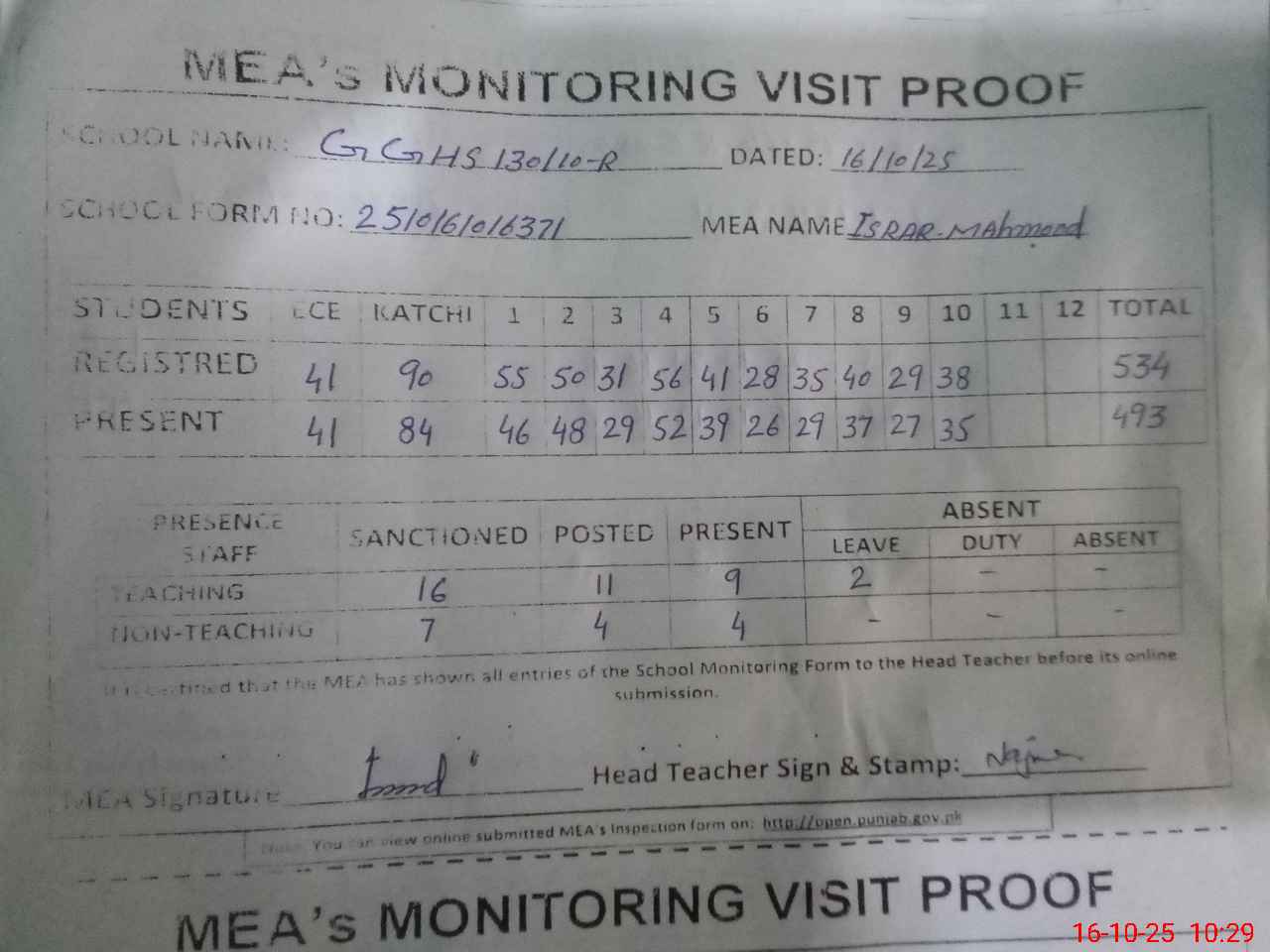 | Attendance Register | Head Teacher | MEA with School | Visit Proof |