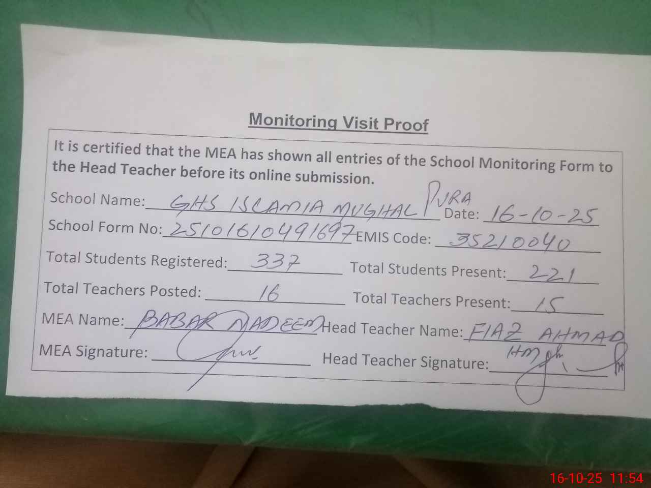 | EMIS Code: 35210040 | Name of School: GHS ISLAMIA MUGHAL PURA | |||