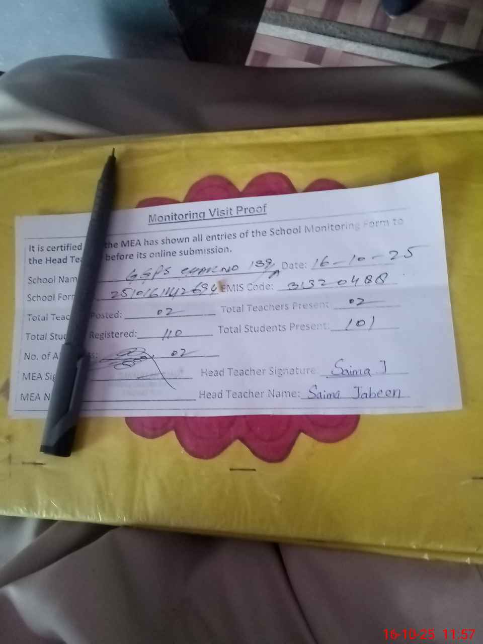 | Attendance Register | Head Teacher | MEA with School | Visit Proof |