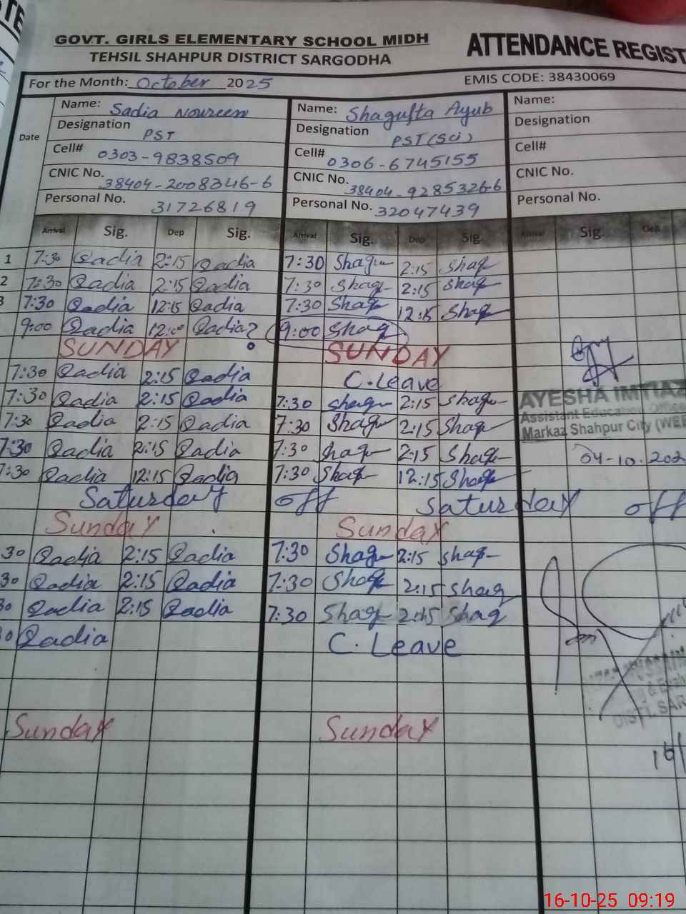 | District: SARGODHA | Tehsil: SHAHPUR | Markaz: SHAHPUR CITY - FEMALE | Level: Middle | |