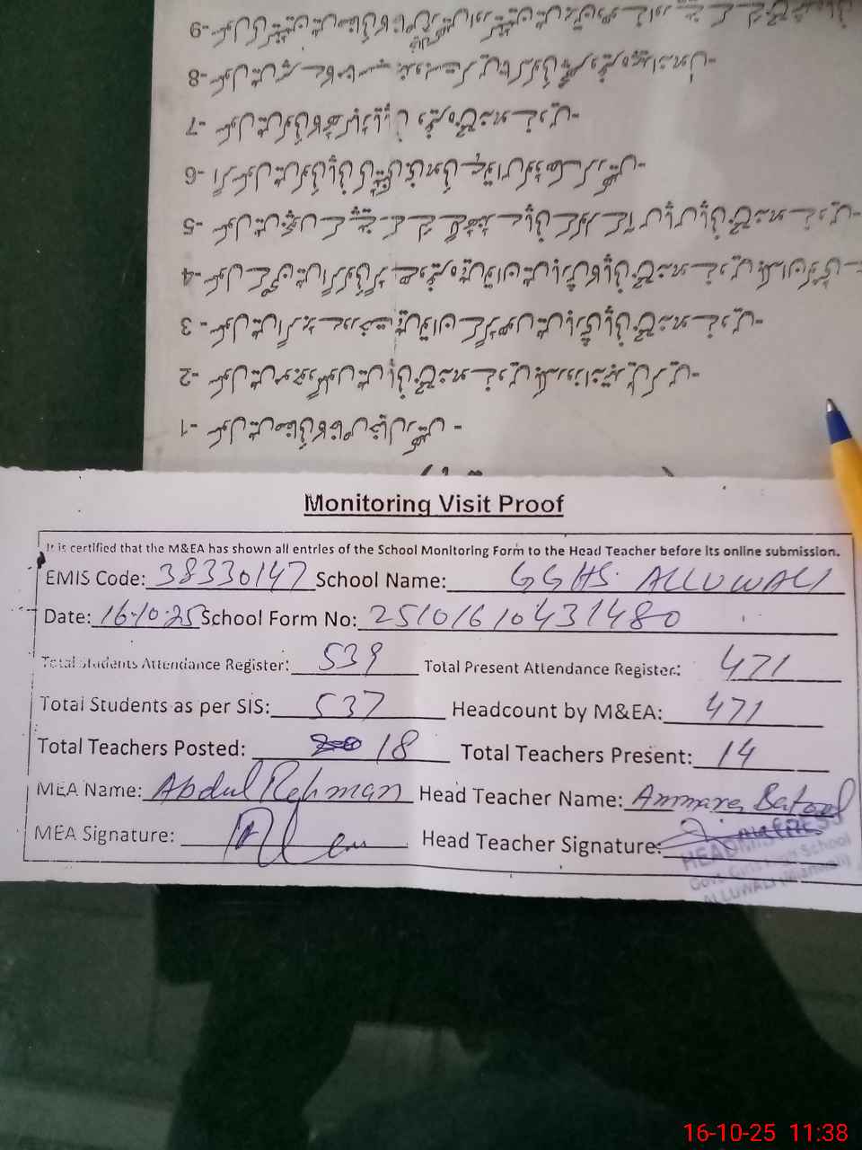 | Attendance Register | Head Teacher | MEA with School | Visit Proof |
