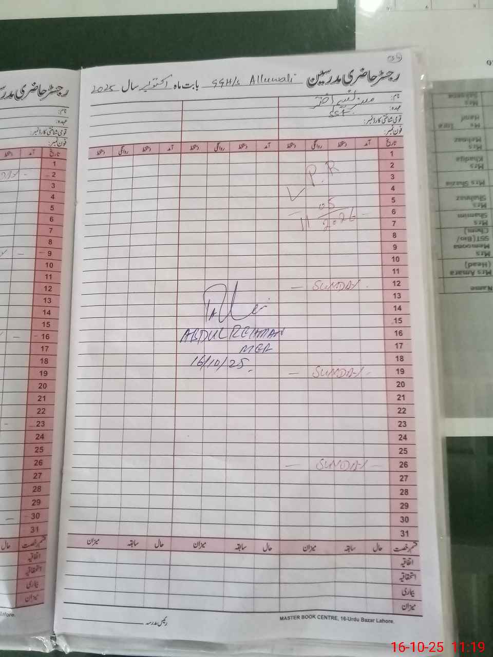 | CNIC | Full Name | Designation | R/C | Absence During Last Calender Month |