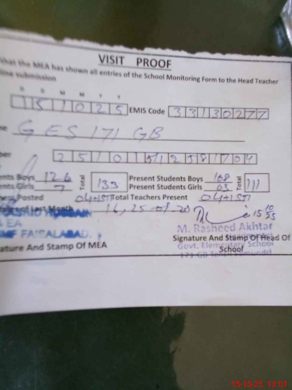 | EMIS Code: 33130277 | Name of School: GES CHAK NO.171/GB | |||