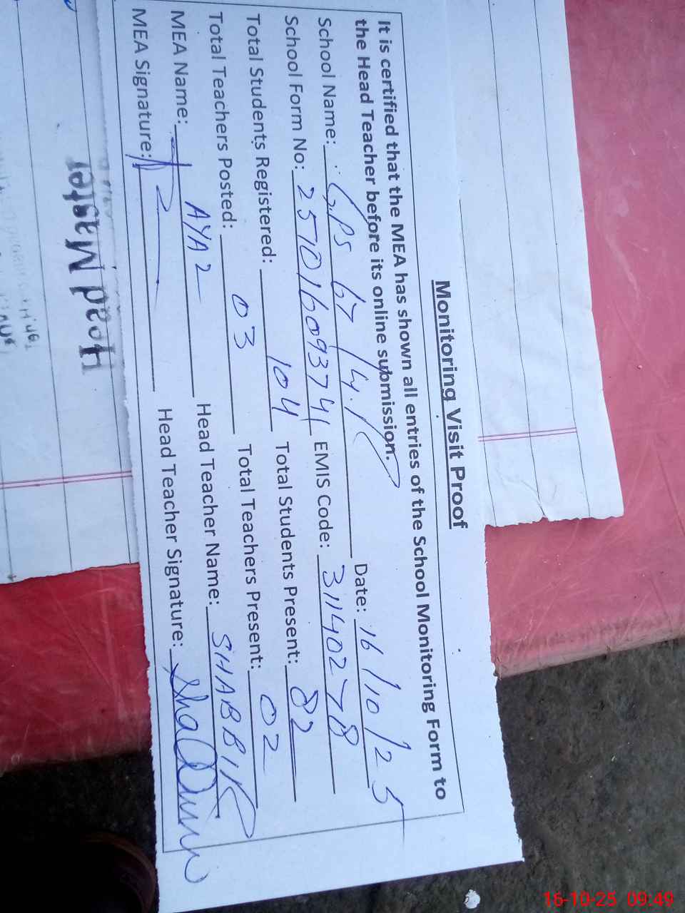 | Attendance Register | Head Teacher | MEA with School | Visit Proof |