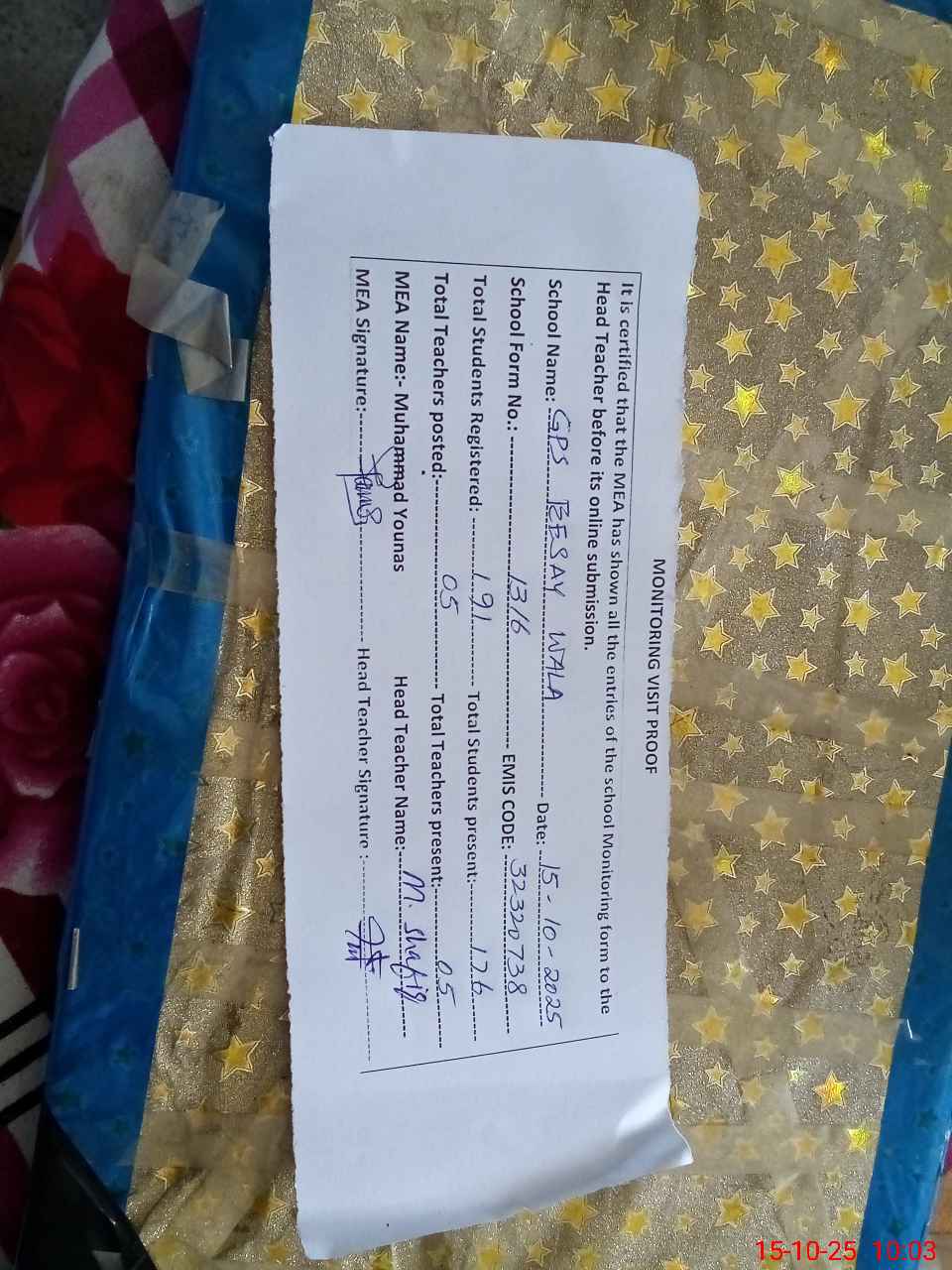 | Attendance Register | Head Teacher | MEA with School | Visit Proof |