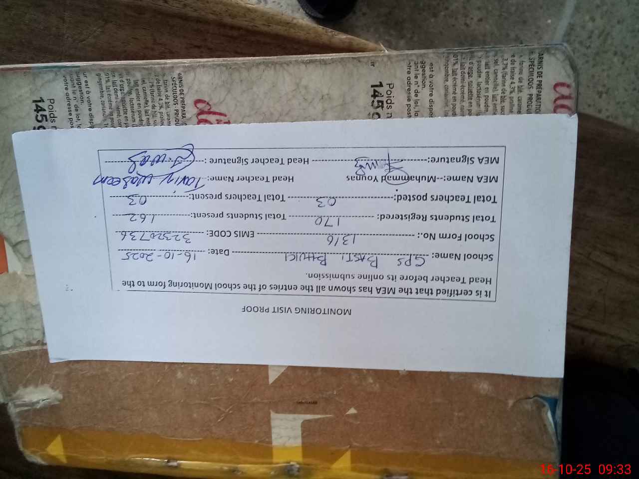 | Attendance Register | Head Teacher | MEA with School | Visit Proof |