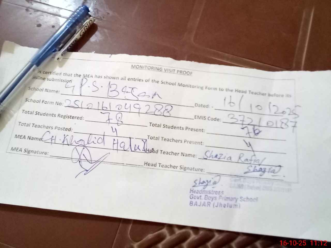 | Attendance Register | Head Teacher | MEA with School | Visit Proof |