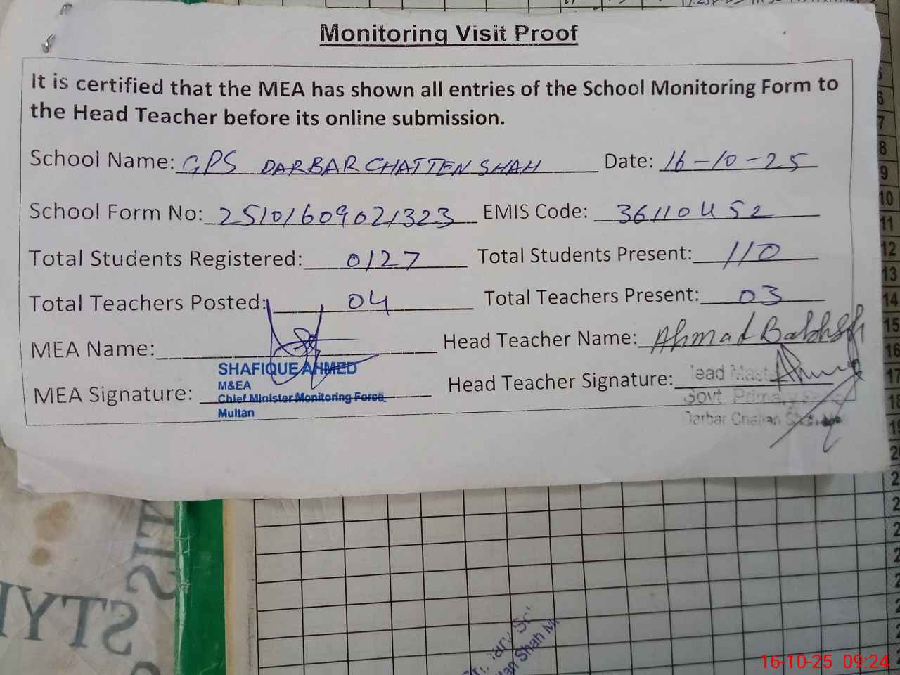 | Attendance Register | Head Teacher | MEA with School | Visit Proof |