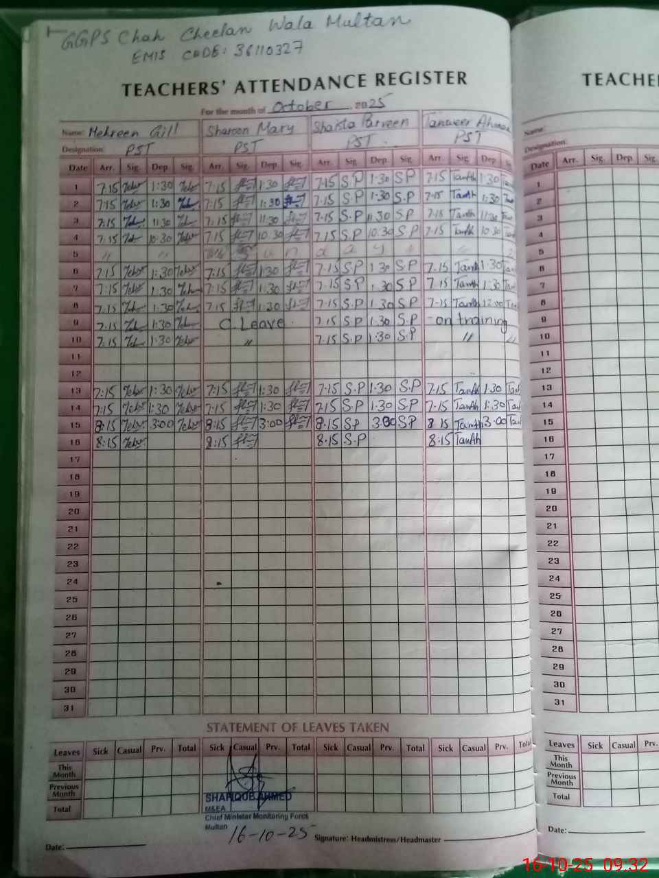 | EMIS Code: 36110327 | Name of School: GGPS CHAH CHEELAN WALA MULTAN | |||