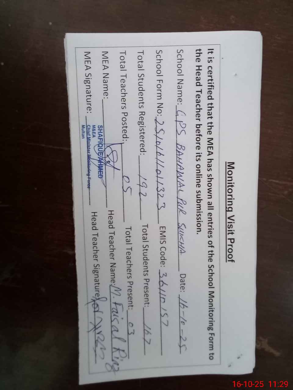 | Attendance Register | Head Teacher | MEA with School | Visit Proof |