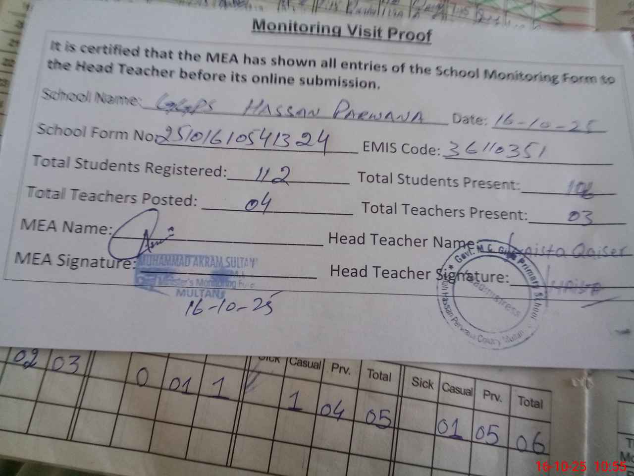 | Attendance Register | Head Teacher | MEA with School | Visit Proof |