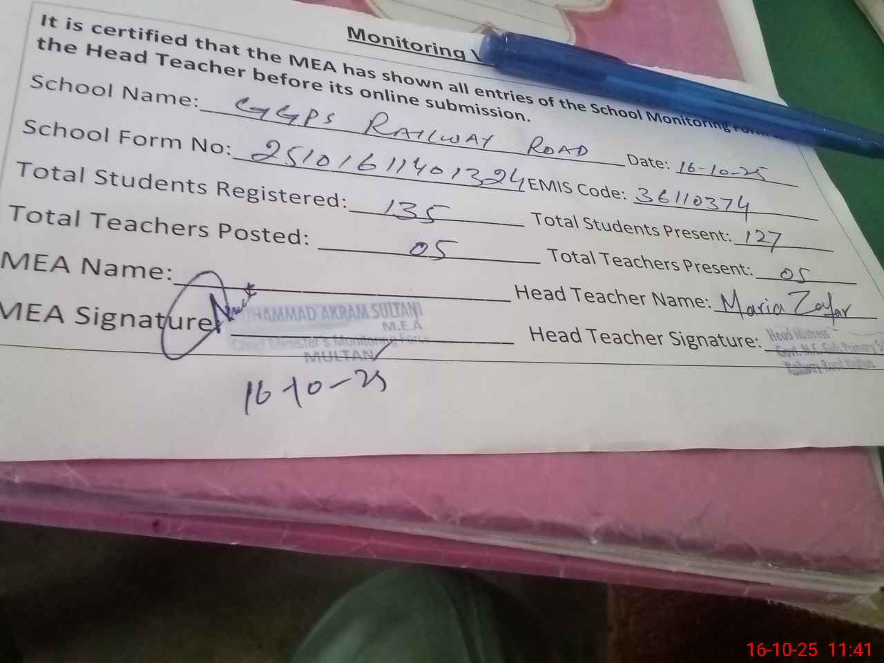 | Attendance Register | Head Teacher | MEA with School | Visit Proof |