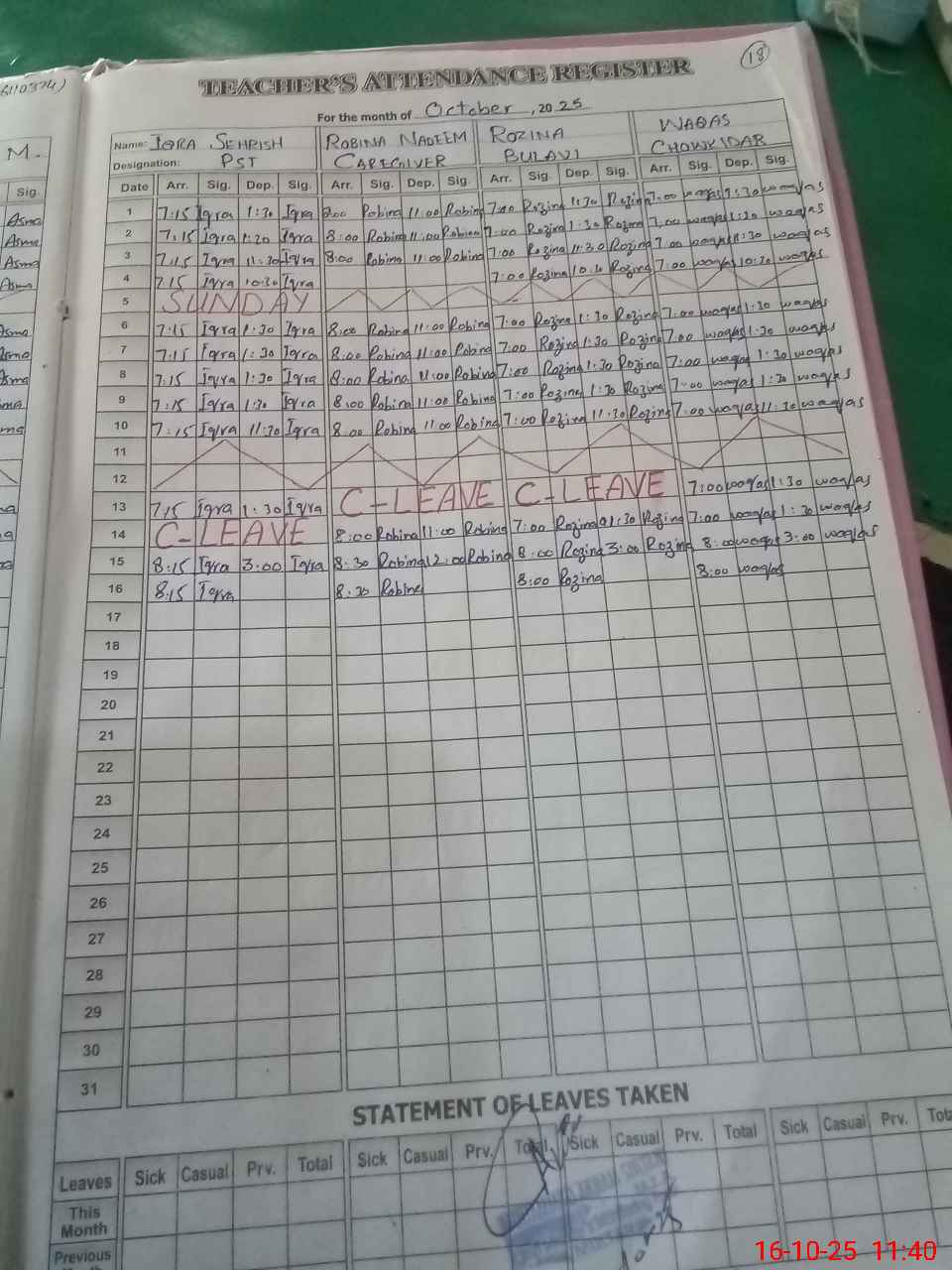 | CNIC | Full Name | Designation | R/C | Absence During Last Calender Month |