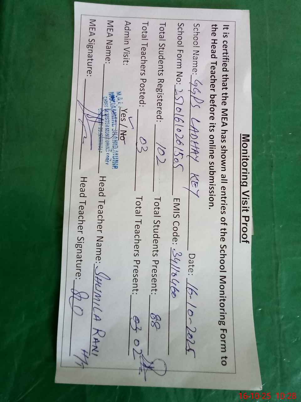 | Monitoring Date: 16-10-2025 | Start Time: 16-10-2025 09:55 AM | End Time: 16-10-2025 10:29 AM | Name of MEA: S-**** Sh**** Mu**** | |