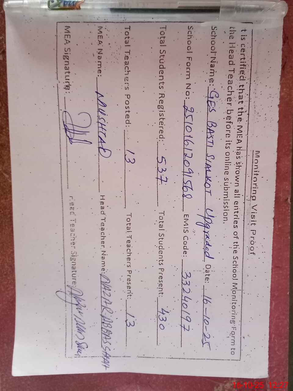 | EMIS Code: 33240197 | Name of School: GES BASTI SIALKOT (Upgraded) | |||