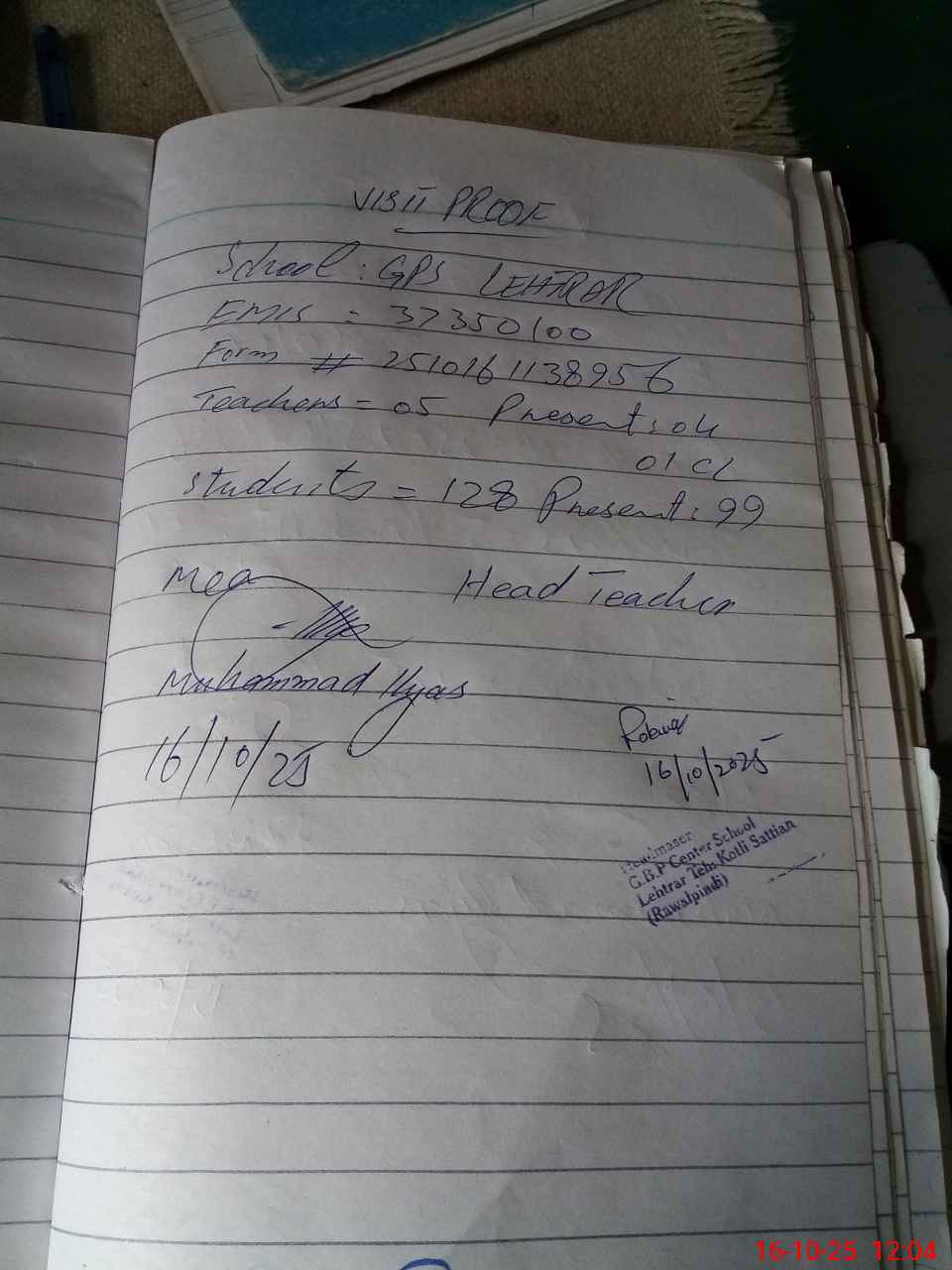 | Attendance Register | Head Teacher | MEA with School | Visit Proof |