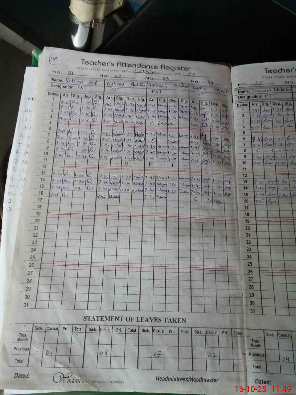 | Leave | Duty | Absent | Maternity | Medical | Ex- Pak |