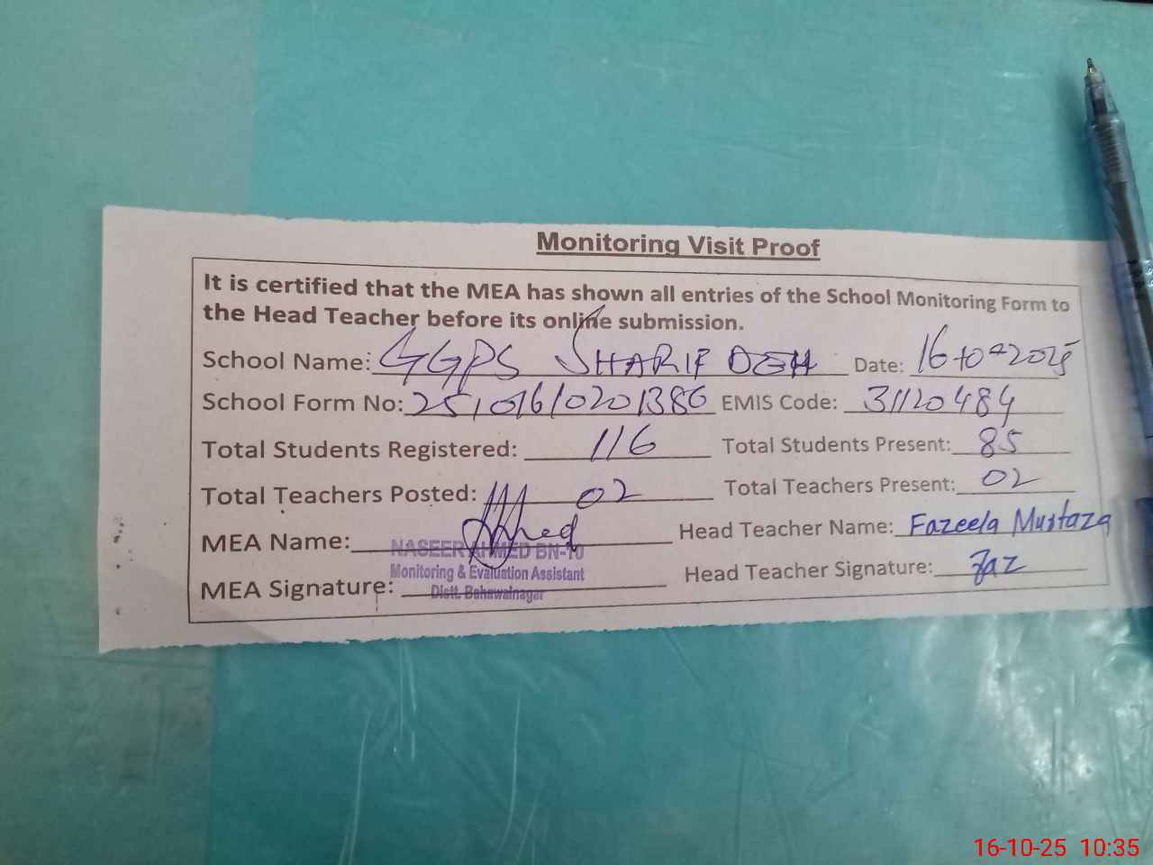 | EMIS Code: 31120484 | Name of School: GGPS SHRIF DEH | |||