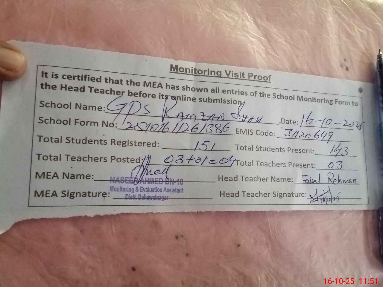 | EMIS Code: 31120649 | Name of School: GPS RAMZAN SHAH | |||
