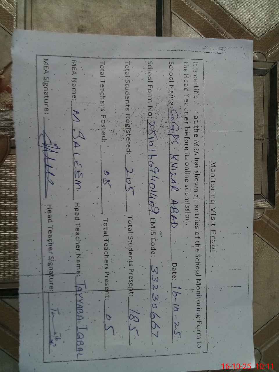 | Certified that this School was Inspected by the Undersigned MEA/DMO Today and the Information Stated Above is as Per Record. | |||||