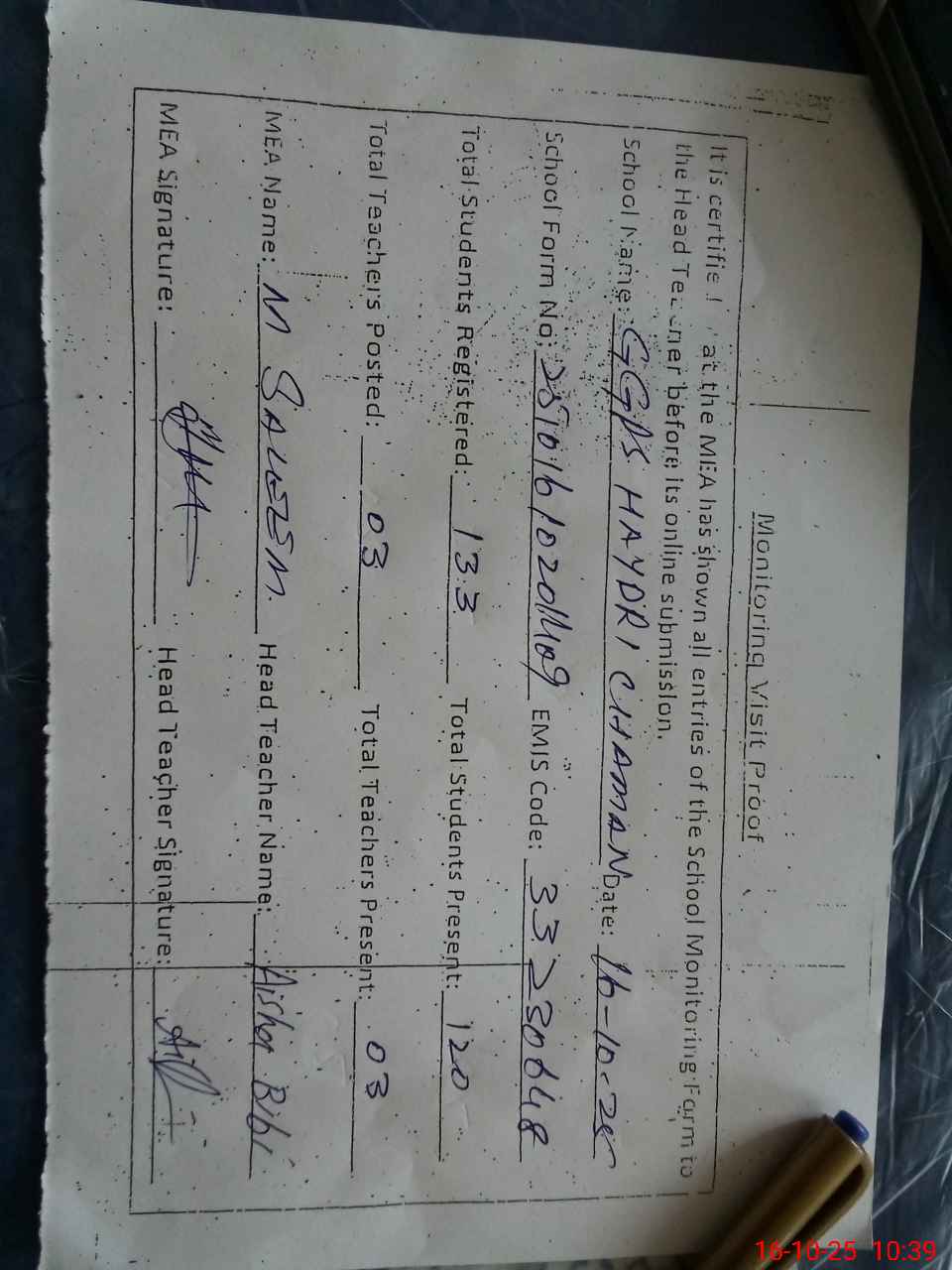 | EMIS Code: 33230648 | Name of School: GMPS HAYDRI CHAMAN | |||