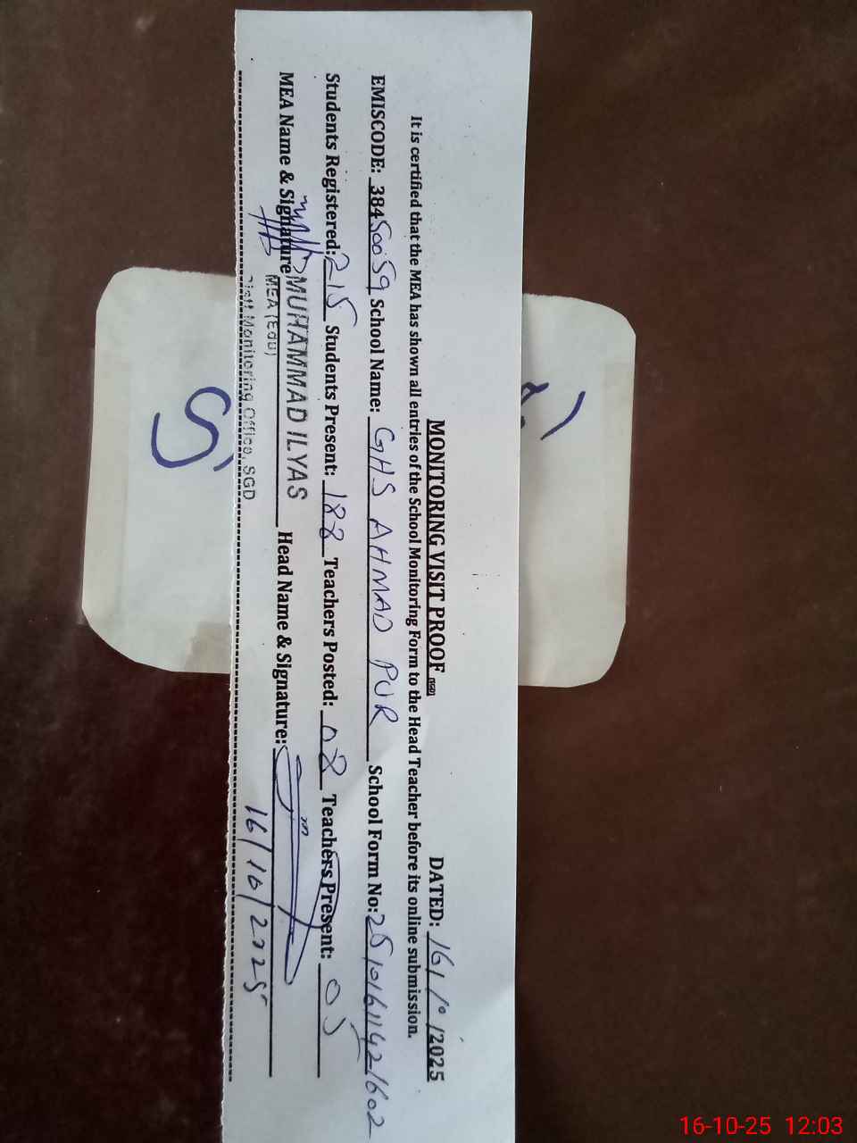 | Certified that this School was Inspected by the Undersigned MEA/DMO Today and the Information Stated Above is as Per Record. | |||||